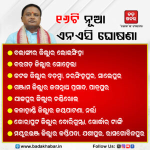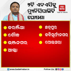 ଏହାସହିତ ଢେଙ୍କାନାଳ ଜିଲ୍ଲାର ଗଁନ୍ଦିଆ, ଗଞ୍ଜାମ ଜିଲ୍ଲାର ଜଗନ୍ନାଥପ୍ରସାଦ ଏବଂ ପାତ୍ରପୁର, ଯାଜପୁର ଜିଲ୍ଲାର ଚଣ୍ଡୀଖୋଲ, କଳାହାଣ୍ଡି ଜିଲ୍ଲାର ନର୍ଲା ଏବଂ ଜୟପାଟଣା, ଖୋର୍ଦ୍ଧା ଜିଲ୍ଲାରୁ ଟାଙ୍ଗୀ, କୋରାପଟୁ ଜିଲ୍ଲାର ବୋରିଗୁମ୍ମା, ମୟୂରଭଞ୍ଜ ଜିଲ୍ଲାର କପ୍ତିପଦା, ଯଶୀପୁର ଓ ରାସଗୋବିନ୍ଦପୁରକୁ ନୂଆ ଏନଏସି ଭାବେ ଘୋଷଣା କରାଯାଇଛି । ସେହିପରି ବର୍ତ୍ତମାନ ଏନଏସି ଥିବା ମୟୂରଭଞ୍ଜର କରଞ୍ଜିଆକୁ ନୂଆ ମ୍ୟୁନିସିପାଲଟି ଭାବେ ଘୋଷଣା କରାଯାଇଛି । ଏହାସହ ବୌଦ୍ଧ ଜିଲ୍ଲାର ବୌଦ୍ଧ, ଗଞ୍ଜାମ ଜିଲ୍ଲାର ସର୍ବାଧିକ ଭଞ୍ଜନଗର, ଆସ୍କା, ଛତ୍ରପୁର, କବିସୂର୍ଯ୍ୟନଗର ଓ ପୋଲସରାକୁ ନୂଆ ମ୍ୟୁନିସିପାଲଟି ଭାବେ ଘୋଷଣା କରିଛନ୍ତି ମୁଖ୍ୟମନ୍ତ୍ରୀ ମୋହନ ଚରଣ ମାଝୀ ।