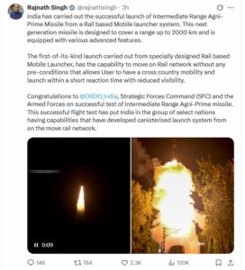 ପ୍ରତିରକ୍ଷା ମନ୍ତ୍ରୀ ରାଜନାଥ ସିଂହ ଏହି ସଫଳତା ପାଇଁ ଡିଆରଡିଓକୁ ଅଭିନନ୍ଦନ ଜଣାଇଛନ୍ତି। ପ୍ରତିରକ୍ଷା ମନ୍ତ୍ରୀ ରାଜନାଥ ସିଂହ ଏକ୍ସରେ ଏକ ପୋଷ୍ଟ ସେୟାର କରି କହିଛନ୍ତି ଯେ, ଭାରତ ମଧ୍ୟମ ଦୂରଗାମୀ ଅଗ୍ନି-ପ୍ରାଇମ୍ କ୍ଷେପଣାସ୍ତ୍ରକୁ ରେଳ-ଆଧାରିତ ମୋବାଇଲ୍ ଲଞ୍ଚର୍ ସିଷ୍ଟମରୁ ସଫଳତାର ସହ ପରୀକ୍ଷଣ କରିଛି। ଏହି ପରବର୍ତ୍ତୀ ପିଢ଼ିର କ୍ଷେପଣାସ୍ତ୍ର ୨୦୦୦ କିଲୋମିଟର ପର୍ୟ୍ୟନ୍ତ ଷ୍ଟ୍ରାଇକ୍ ରେଞ୍ଜ ପାଇଁ ଡିଜାଇନ୍ କରାଯାଇଛି ଏବଂ ଏଥିରେ ଅନେକ ଉନ୍ନତ ବୈଶିଷ୍ଟ୍ୟ ରହିଛି। ଏହି କ୍ଷେପଣାସ୍ତ୍ରଟି ଏକ ବଡ଼, ଦୃଢ଼ କ୍ୟାନିଷ୍ଟରରେ ରଖାଯାଇଛି। ଏହା ପାଣିପାଗ ପ୍ରତି ମଧ୍ୟ ପ୍ରତିରୋଧୀ। ଏହା ପ୍ୟାକ୍ ହୋଇ ରହିଥିବାରୁ ଏହାକୁ କମ୍ ଥର ରକ୍ଷଣାବେକ୍ଷଣ ଆବଶ୍ୟକ ହୁଏ।