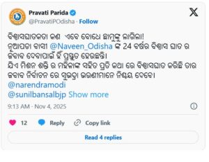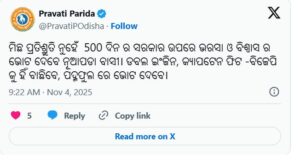 ଭୁବନେଶ୍ୱର (ବଡ଼ ଖବର ବ୍ୟୁରୋ): ଉପ ମୁଖ୍ୟମନ୍ତ୍ରୀ ପ୍ରଭାତୀ ପରିଡ଼ା ବିଜେଡି ସଭାପତି ନବୀନ ପଟ୍ଟନାୟକଙ୍କୁ କଟାକ୍ଷ କରିବା ସହ କଡ଼ା ଜବାବ୍ ଦେଇଛନ୍ତି। ସେ କହିଛନ୍ତି, ମିଛ ପ୍ରତିଶ୍ରୁତି ନୁହେଁ ୫୦୦ ଦିନର ସରକାର ଉପରେ ଭରସା ଓ ବିଶ୍ୱାସର ଭୋଟ ଦେବେ ନୂଆପଡ଼ାବାସୀ। ଡବଲ ଇଂଜିନ, କ୍ୟାପଟେନ ଫିଟ୍ ବିଜେପିକୁ ହିଁ ବାଛିବେ, ପଦ୍ମଫୁଲରେ ଭୋଟ ଦେବେ। ଏହାସହ ନବୀନଙ୍କ ୨୪ବର୍ଷର ବିଶ୍ବାସଘାତକତାର ଜବାବ ଦେବାକୁ ପ୍ରସ୍ତୁତ ହେଉଛନ୍ତି ନୂଆପଡ଼ାବାସୀ । ଯିଏ ମିଶନ ଶକ୍ତି ମହିଳାଙ୍କ ସହ ପ୍ରତିକଥାରେ ବିଶ୍ବାସଘାତ କରିଛି ତାର ଜବାବ ନିର୍ବାଚନରେ ସୁଭଦ୍ରା ଭଉଣୀମାନେ ଦେବେ ବୋଲି ସୋସିଆଲ ମିଡିଆରେ ଲେଖିଛନ୍ତି ପ୍ରଭାତି ପରିଡ଼ା ।