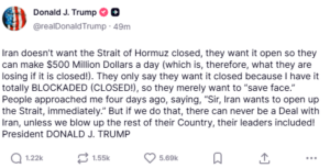 ଡୋନାଲ୍ଡ ଟ୍ରମ୍ପ ଆହୁରି ଲେଖିଛନ୍ତି, “ପାକିସ୍ତାନର ଅନୁରୋଧରେ, ଇରାନ ଏହାର ପ୍ରସ୍ତାବ ଉପସ୍ଥାପନ କରିବା ଏବଂ ଆଲୋଚନା ସମାପ୍ତ କରିବା ପର୍ଯ୍ୟନ୍ତ ଯୁଦ୍ଧବିରତିକୁ ବୃଦ୍ଧି କରୁଛି, ଏହାର ଫଳାଫଳ ଯାହା ହେଉନା କାହିଁକି । ମୁଁ ମୋର ସେନାକୁ ଅବରୋଧ ବଜାୟ ରଖିବାକୁ ଏବଂ ପରବର୍ତ୍ତୀ ଘଟଣା ପାଇଁ ପ୍ରସ୍ତୁତ ରହିବାକୁ ନିର୍ଦ୍ଦେଶ ଦେଇଛି । ” ଡୋନାଲ୍ଡ ଟ୍ରମ୍ପଙ୍କ ଘୋଷଣା ପରେ ପୁଣି ଥରେ ଶତ୍ରୁତା ଆରମ୍ଭ ହେବାର ଆଶଙ୍କାକୁ ସାମୟିକ ଭାବରେ ଏଡାଯାଇଛି । ତଥାପି, ଉଭୟ ପକ୍ଷ ମଧ୍ୟରେ ଗଭୀର ମତଭେଦ ରହିଛି । ଆମେରିକାର ଆଲୋଚନା ଦଳକୁ ନେତୃତ୍ୱ ଦେବା ପାଇଁ ଉପରାଷ୍ଟ୍ରପତି ଜେ.ଡି. ଭାନ୍ସଙ୍କ ପାକିସ୍ତାନ ଗସ୍ତ ସ୍ଥଗିତ ରଖାଯାଇଛି । ହୋର୍ମୁଜ ପ୍ରଣାଳୀରେ ଇରାନ ଉପରେ ଆମେରିକାର ଅବରୋଧ ମଧ୍ୟ ବଳବତ୍ତର ରହିଛି ।
