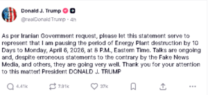 ତଥାପି, ଏହି ପଦକ୍ଷେପ ଯୁଦ୍ଧବିରତିର ଆରମ୍ଭକୁ ପ୍ରତିନିଧିତ୍ୱ କରୁଛି ନା ଯୁଦ୍ଧ ପୁଣି ଆଗକୁ ବଢ଼ିବ, ତାହା ଆଗାମୀ ଦିନରେ ନିର୍ଣ୍ଣୟ କରାଯିବ। ଟ୍ରମ୍ପ ସୋସିଆଲ ମିଡିଆ ପ୍ଲାଟଫର୍ମ ଟ୍ରୁଥ୍ ସୋସିଆଲରେ ପୋଷ୍ଟ କରି ଲେଖିଛନ୍ତି, ‘ଇରାନ ସରକାରଙ୍କ ଅନୁରୋଧରେ, ମୁଁ ଶକ୍ତି ପ୍ରତିଷ୍ଠାନଗୁଡ଼ିକୁ ଧ୍ୱଂସ କରିବା ପାଇଁ କାର୍ଯ୍ୟାନୁଷ୍ଠାନକୁ ୧୦ଦିନ ପାଇଁ ସ୍ଥଗିତ ରଖୁଛି, ଯାହା ୬ଏପ୍ରିଲ, ୨୦୨୬ ସୋମବାର ରାତି ୮ଟା ପର୍ୟ୍ୟନ୍ତ ଜାରି ରହିବ।
